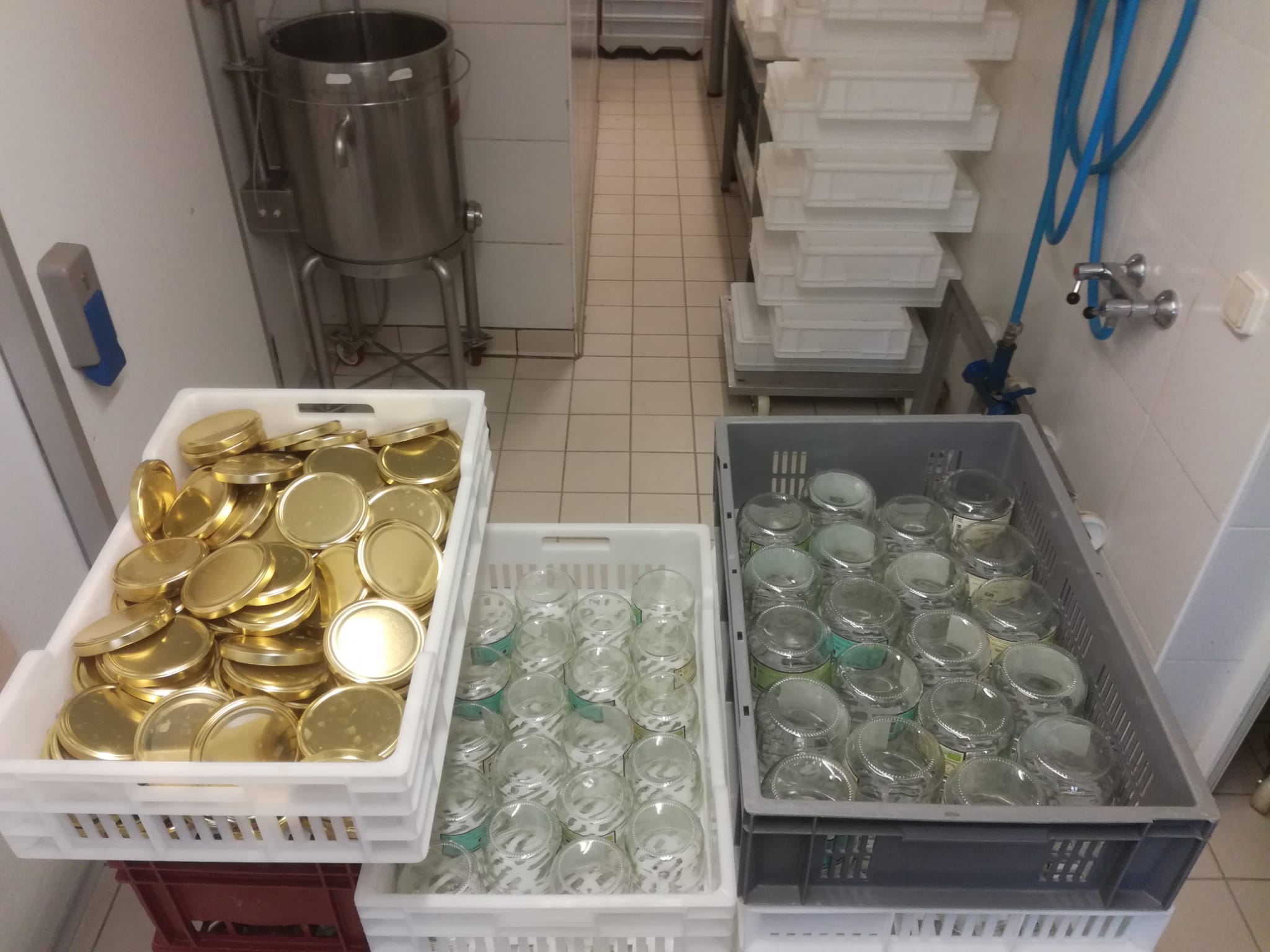 - le conditionnement en pots d'où le choix du 400g (on aurait souhaité le 500g qui n'existe pas...), bon compromis entre volume « familial » et une mise en pot manuelle pas trop chronophage. D'autre part, l'investissement d'une conditionneuse de pots en verre 125g est beaucoup trop onéreuse à l'échelle de la ferme (50 000€ environ),