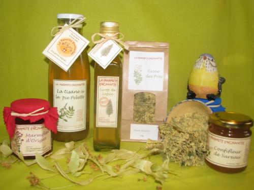 Les produits sont exclusivement composés de feurs et plantes sauvages cueillies localement (Sureau, Reine des prés, Origan, Pissenlit, Sapin, Tilleul, Acacia, Thym (cueilli en Ardèche)) ainsi que des plantes cultvées (Hysope, Mélisse, Romarin) sans aucun produit chimique.